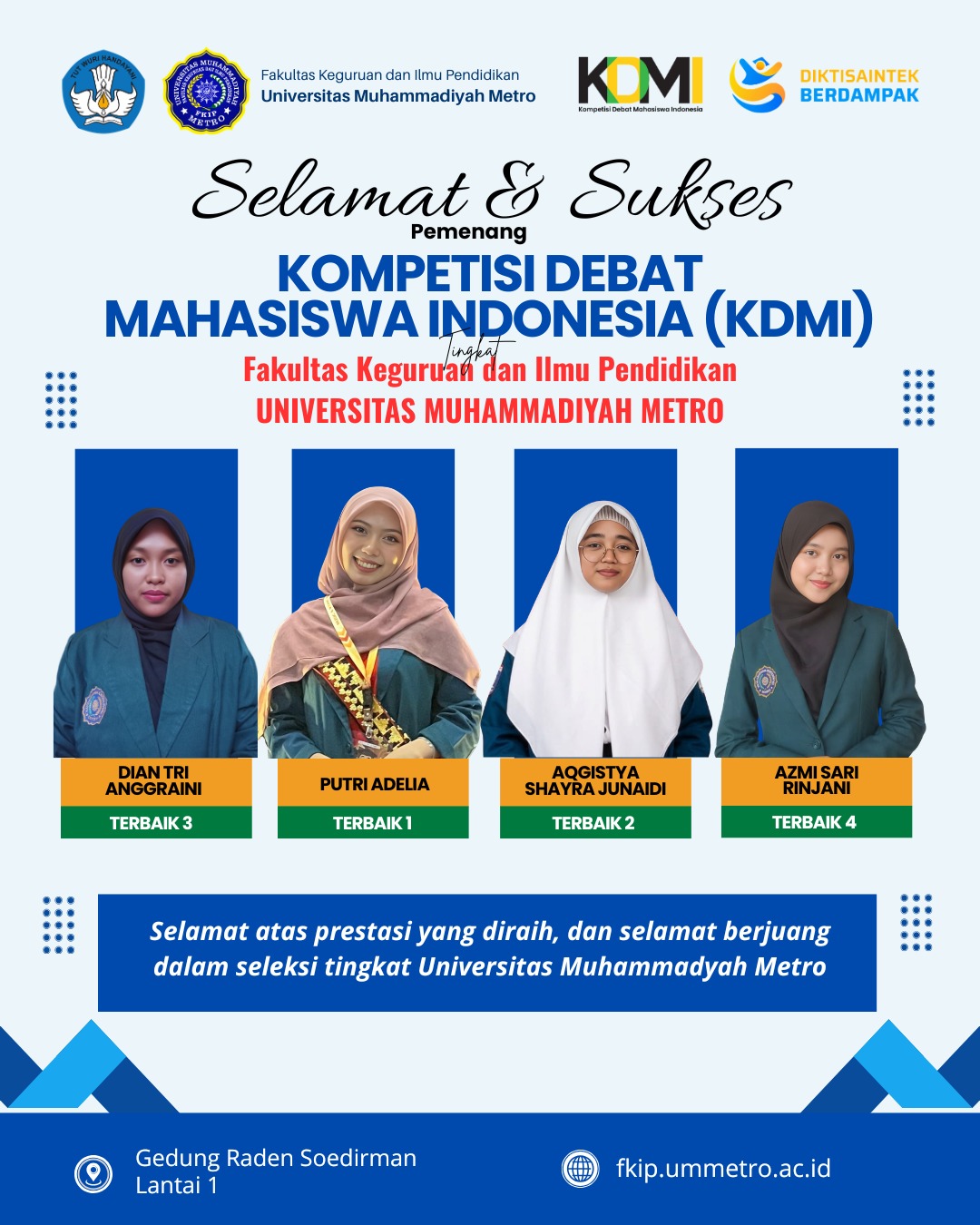 Fakultas Keguruan dan Ilmu Pendidikan (FKIP) Universitas Muhammadiyah Metro telah sukses menyelenggarakan seleksi Kompetisi Debat Mahasiswa Indonesia (KDMI) 2026. Ajang bergengsi ini diikuti oleh mahasiswa dari berbagai program studi, dengan tujuan untuk mencari perwakilan terbaik FKIP dalam kompetisi debat tingkat universitas dan nasional.