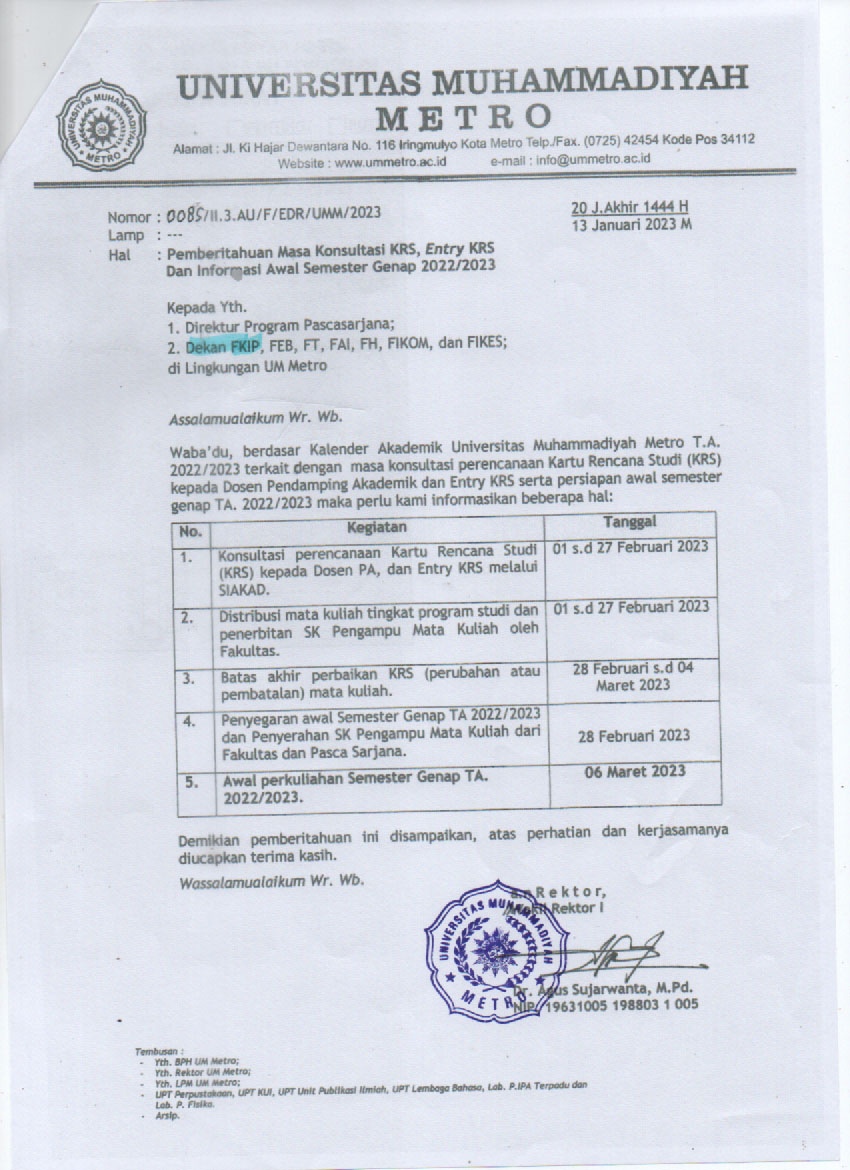 Diinformasikan kepada seluruh Mahasiswa FKIP UM Metro, berikut kami sampaiakan pemberitahuan masa konsultasi KRS, Entry KRS dan Informasi Awal Semeter Genap 2022/2023;