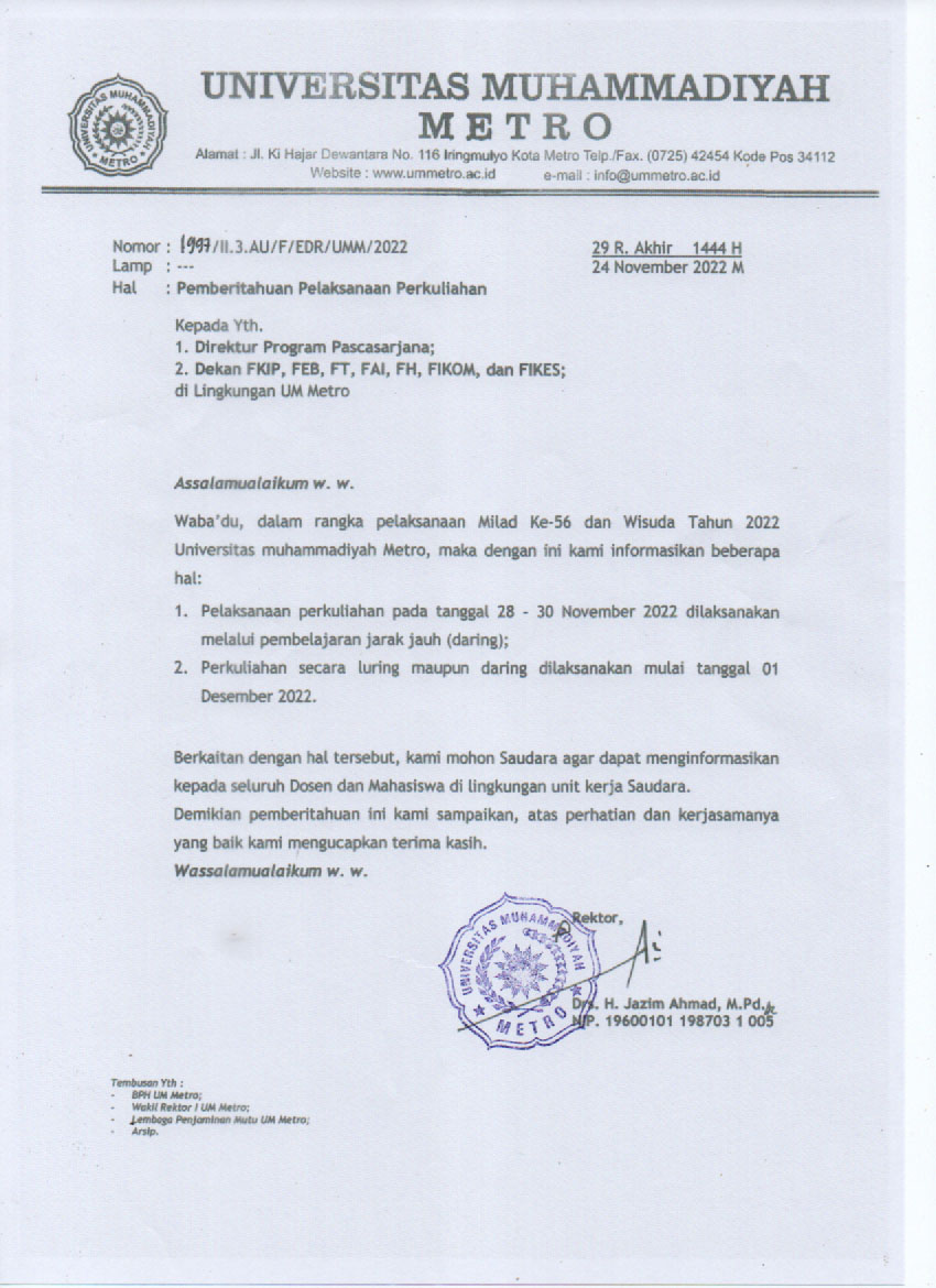 1. Pelaksanaan perkuliahan pada tanggal 28 s/d 30 November 2022 dilaksanakan melalui daring dan kembali melalui luring mulai tanggal 1 Desember 2022